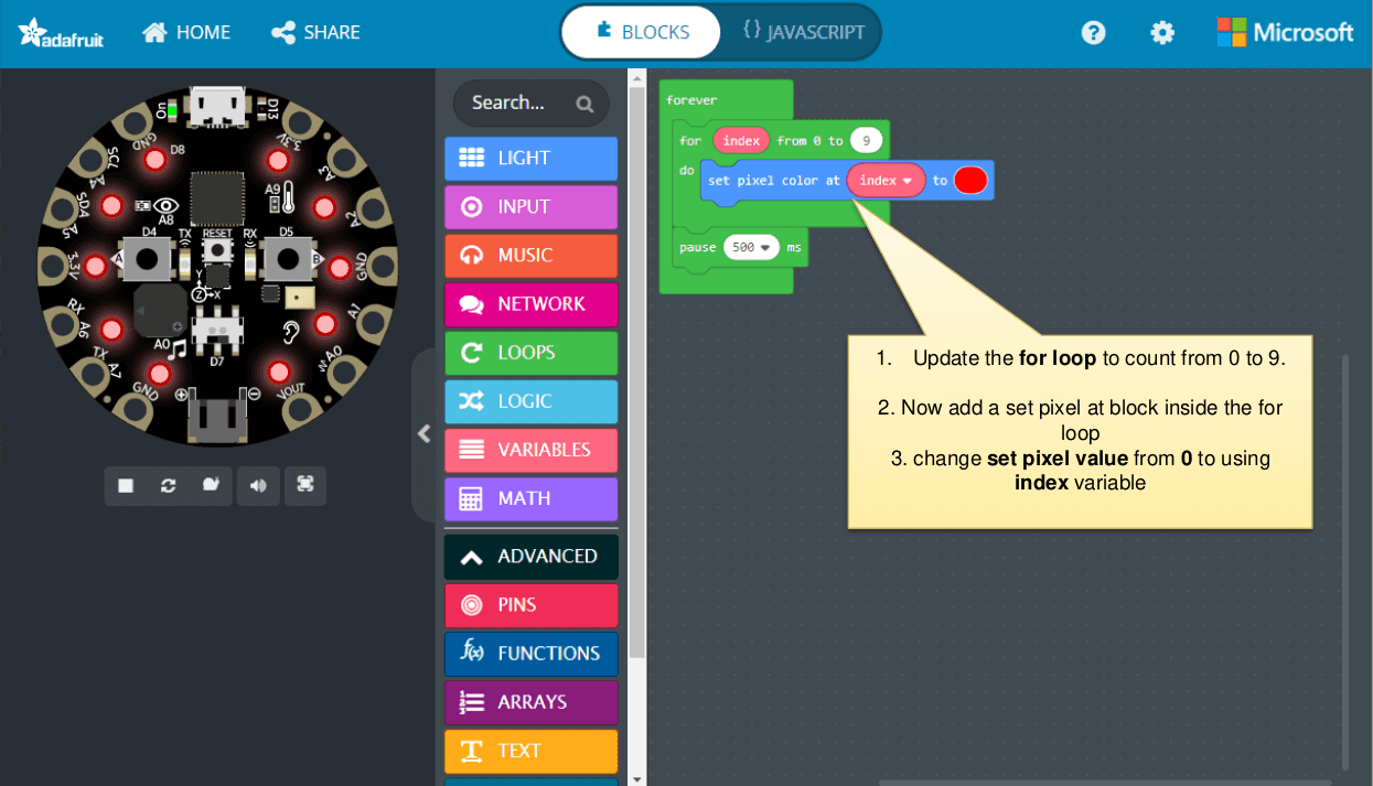 - First Turn every ODD (1,3,5,7,9) numbered neo pixel led to RED.