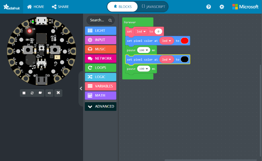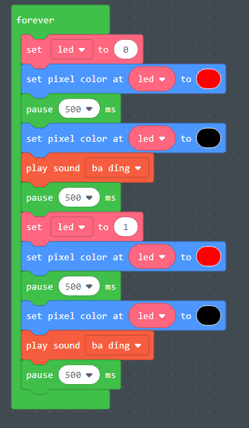 - In order to make the led light number 0 blink red/white you will need to set the pixel color to red, then pause, and then set it to white, and then pause.