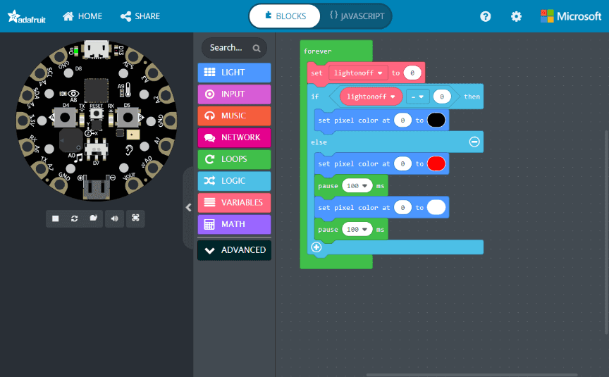 - For the “If……else” statement set the criteria so that if the value of ” lightonoff ” is equal to “0” then the pixel color at “0” will be black.