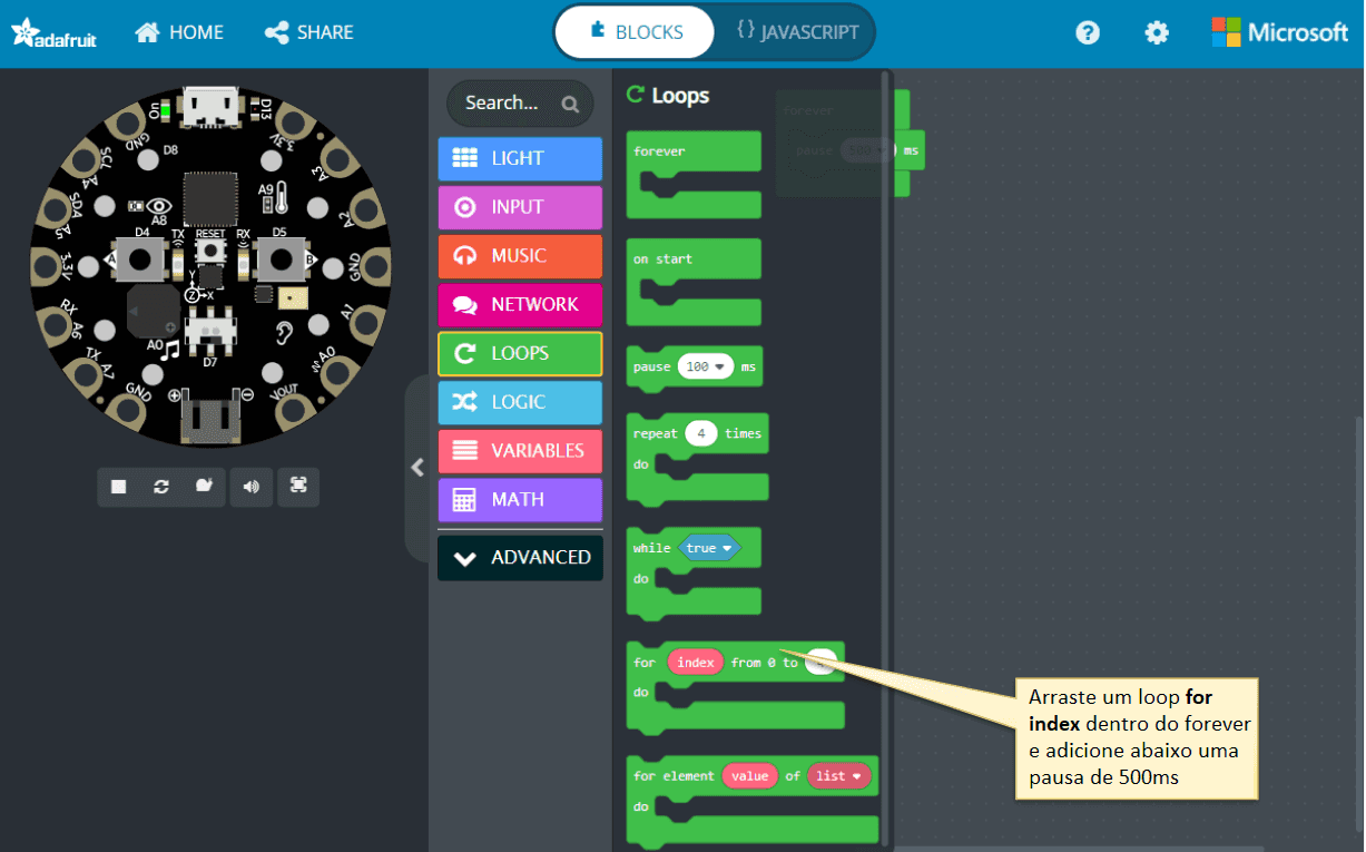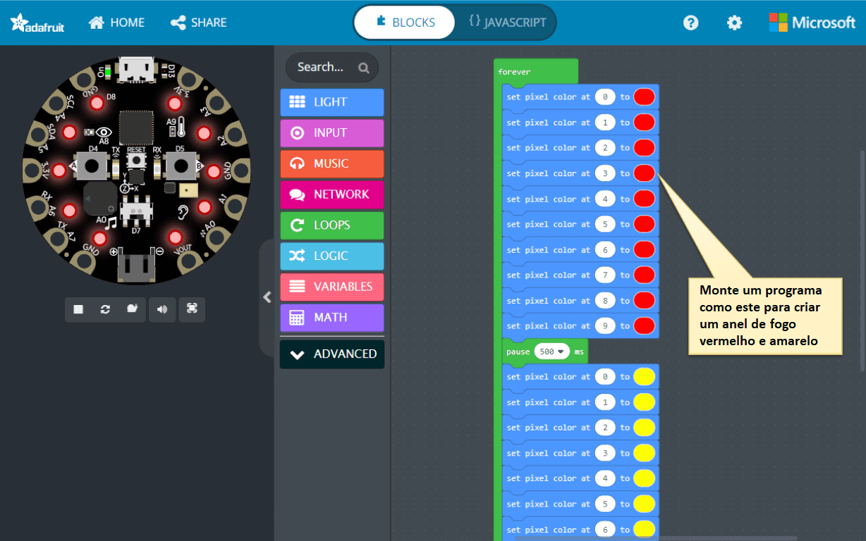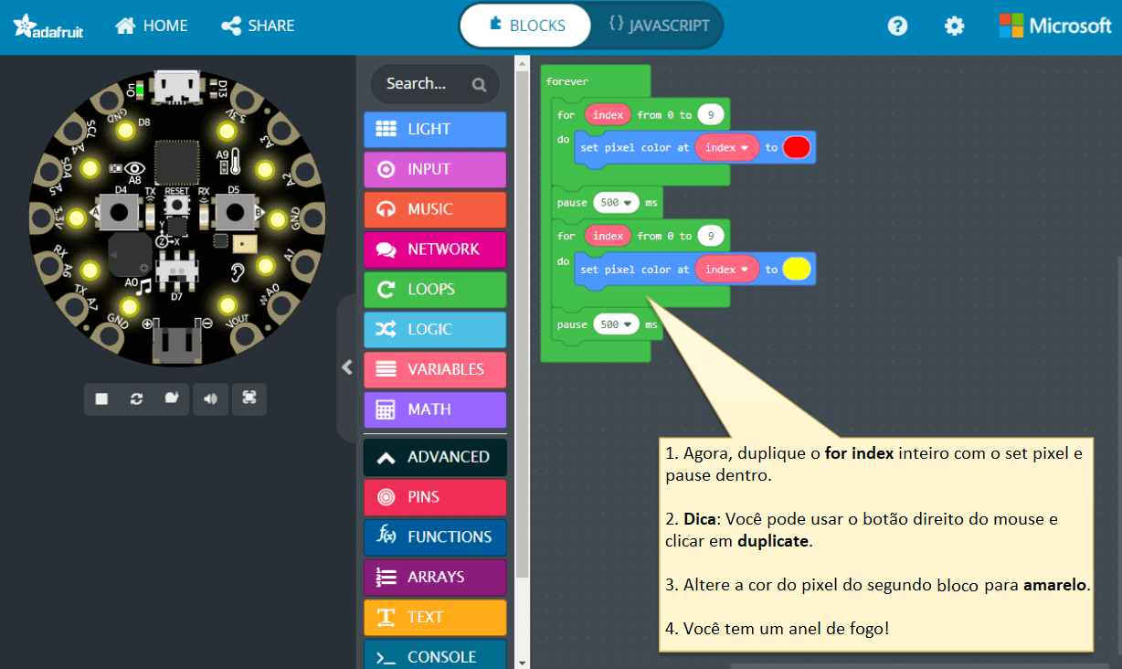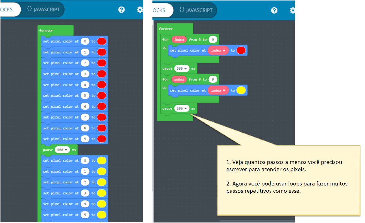 Projeto: Tarefa para iluminar pixels de números ÍMPARES e pixels de números pares em um loop contínuo usando blocos for