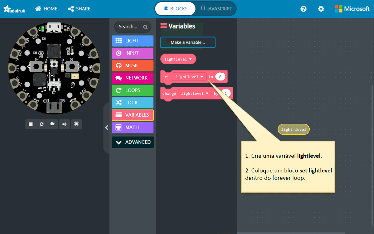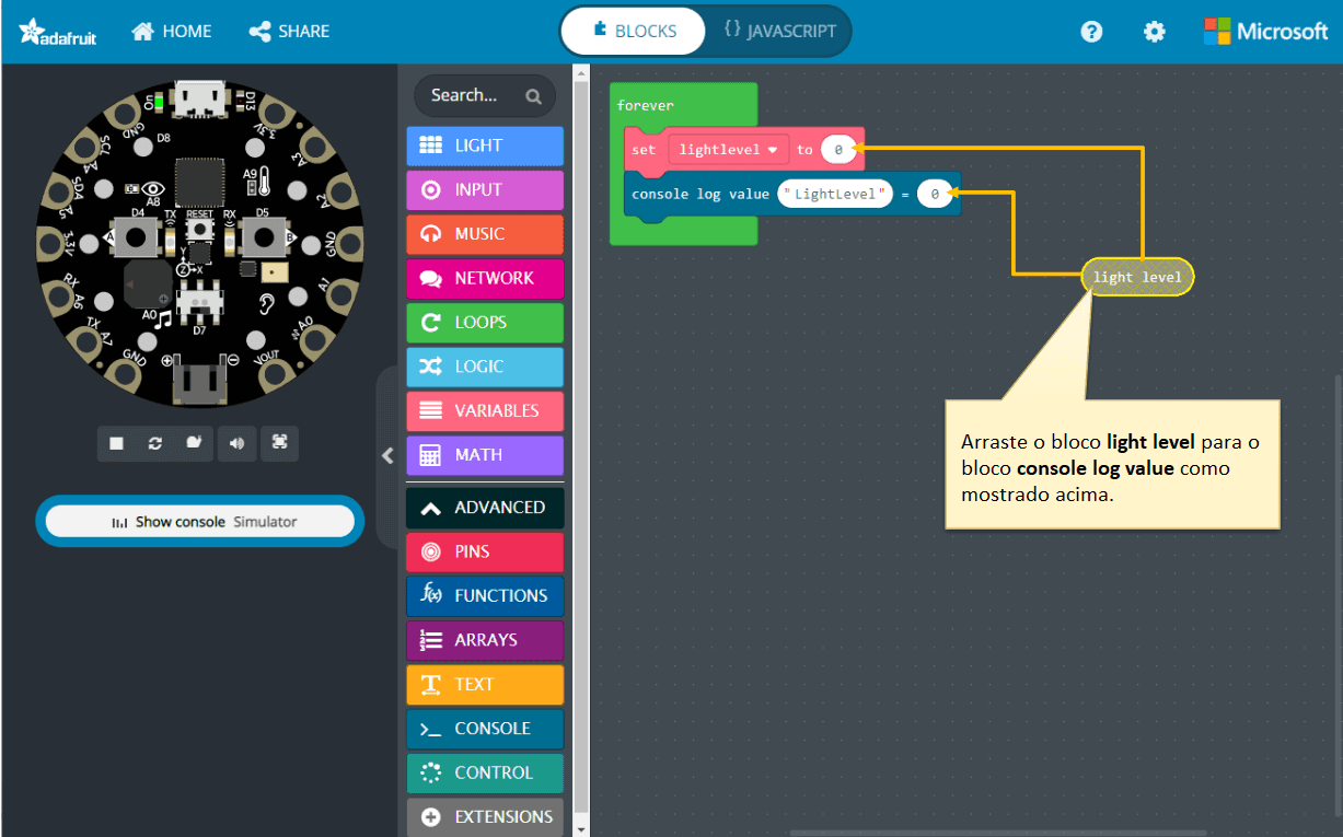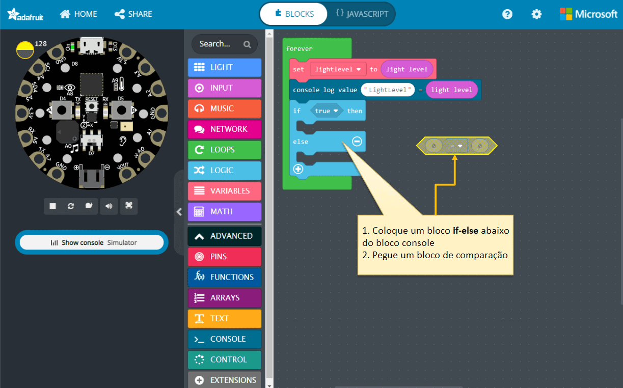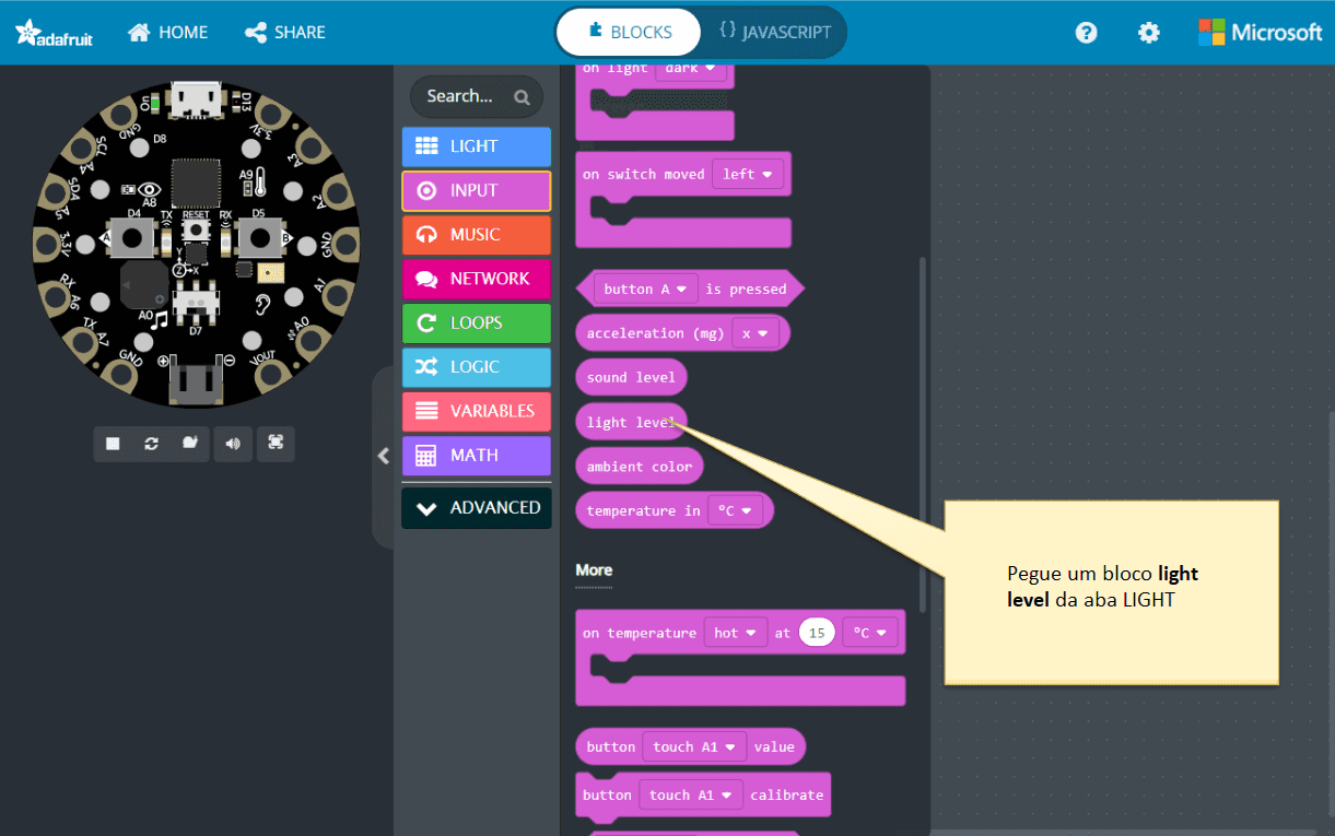 Indo além: modifique o programa do sensor de luz para que ele seja executado somente quando o Botão A for clicado. Dica: use o bloco “On Button” dos Blocos de ENTRADA.