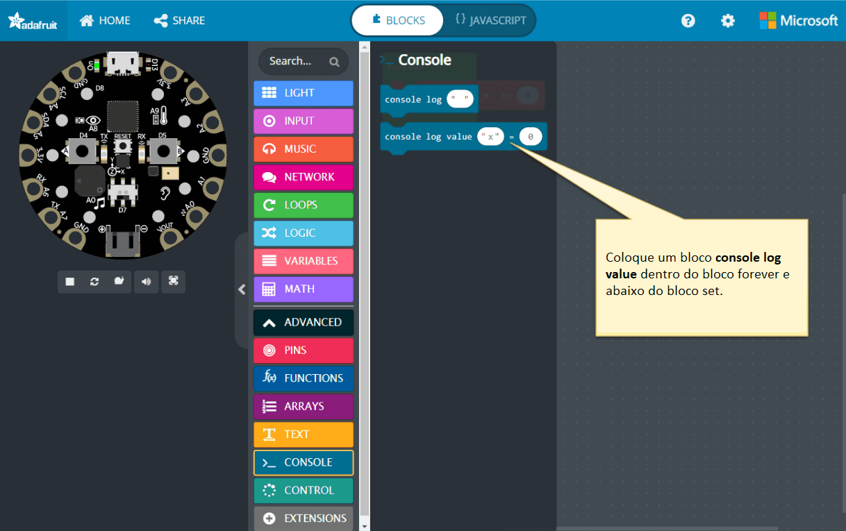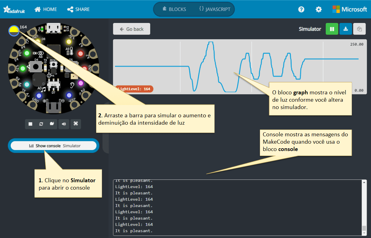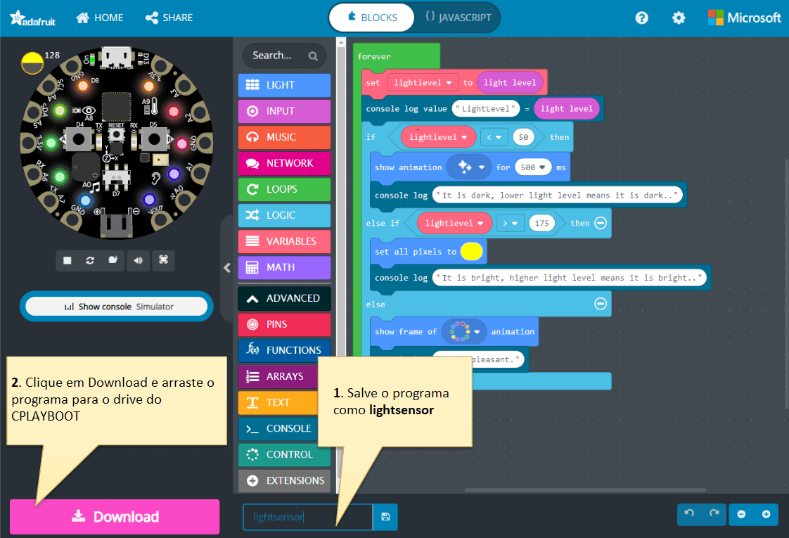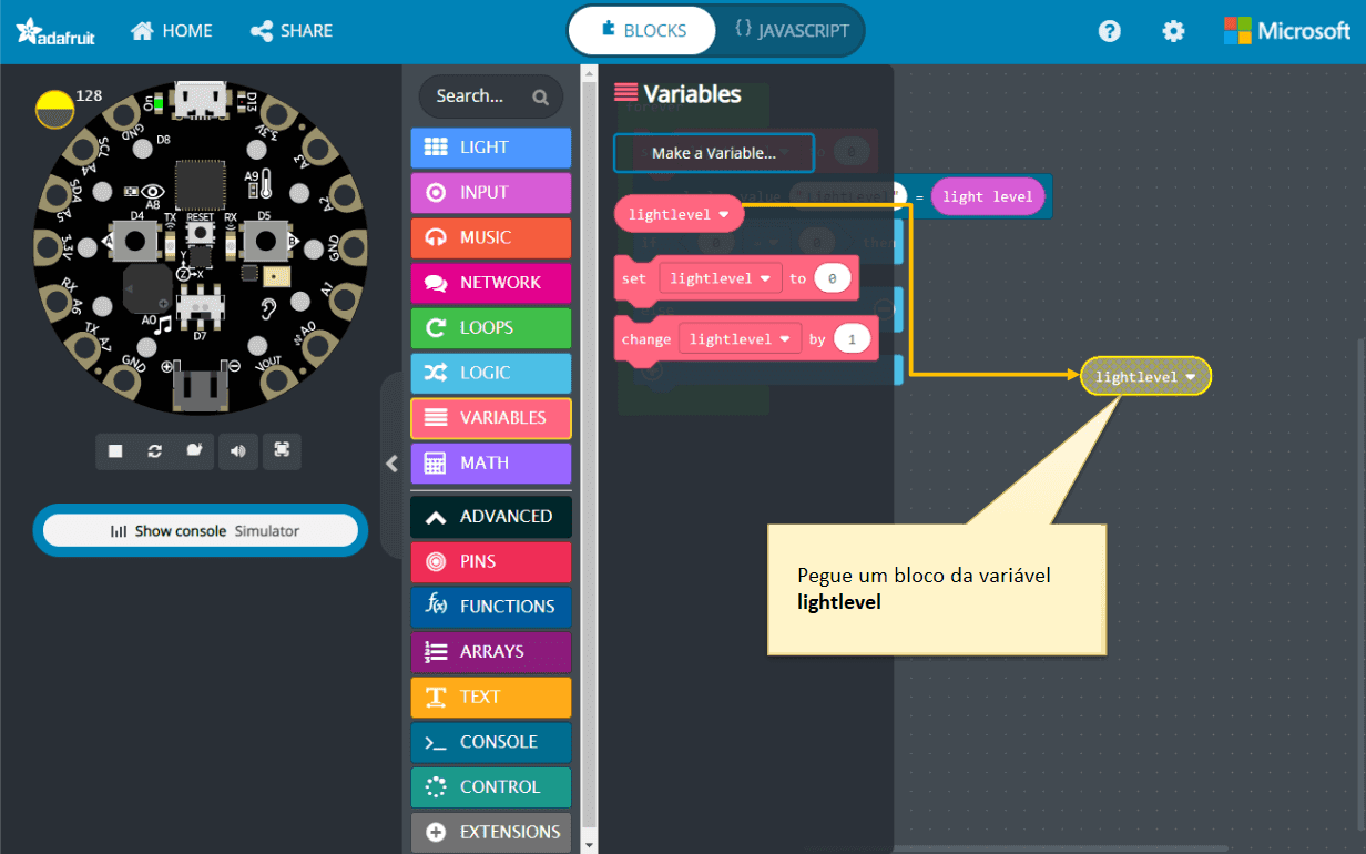 Indo além: modifique o programa do sensor de luz para que ele seja executado somente quando o Botão A for clicado. Dica: use o bloco “On Button” dos Blocos de ENTRADA.