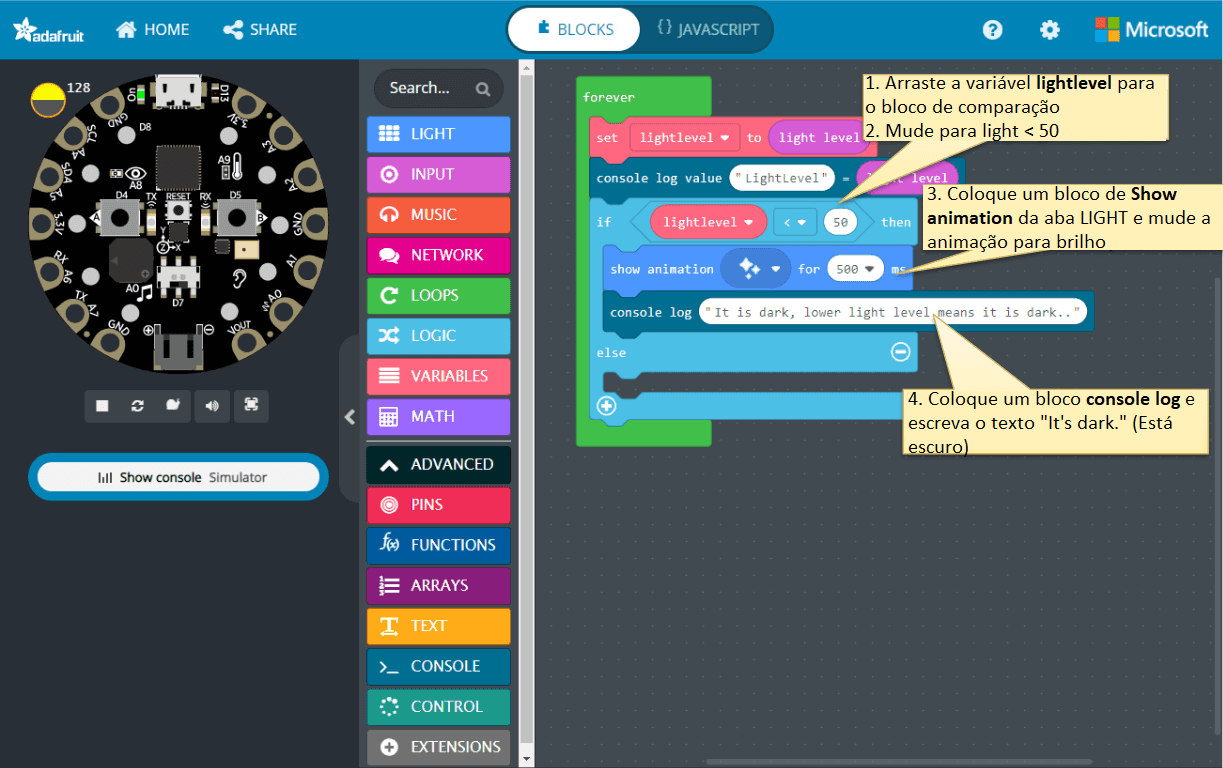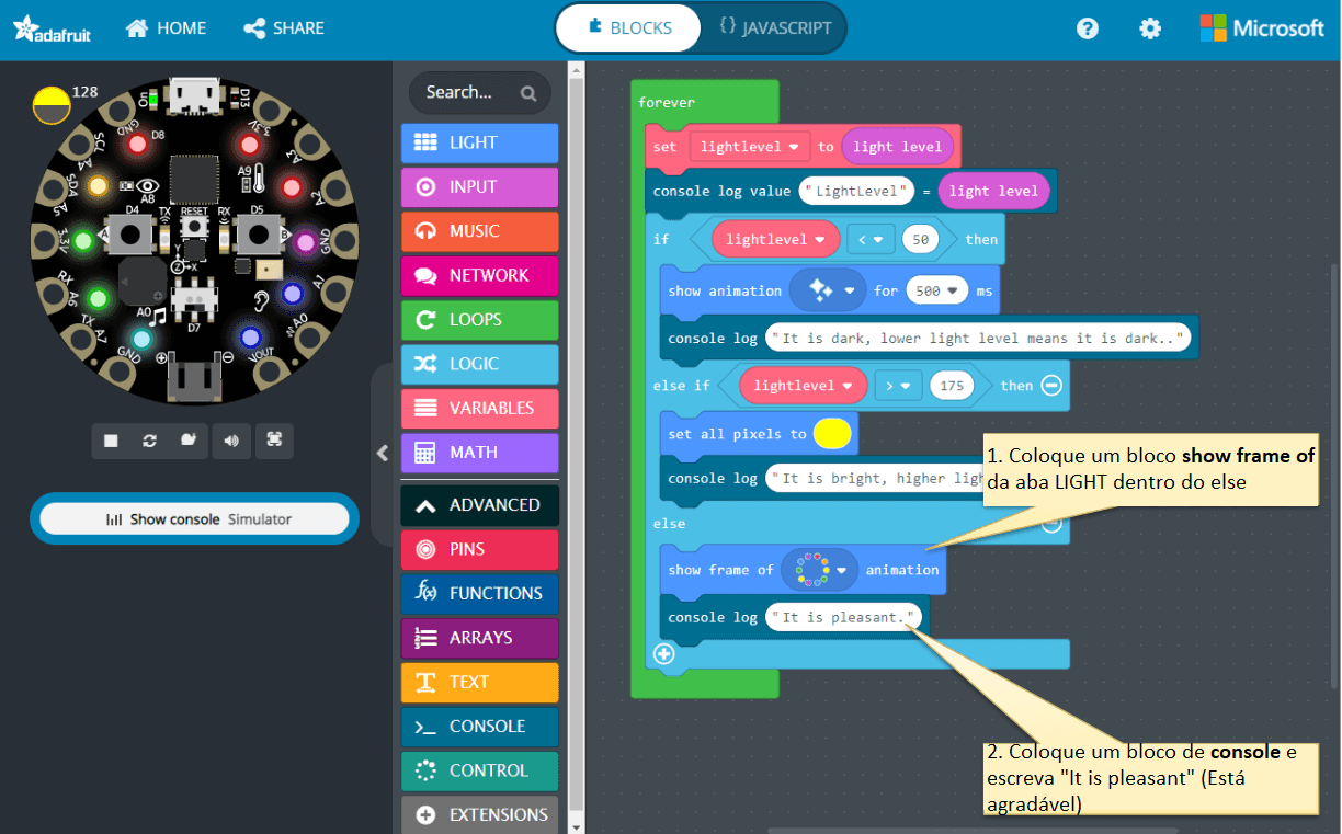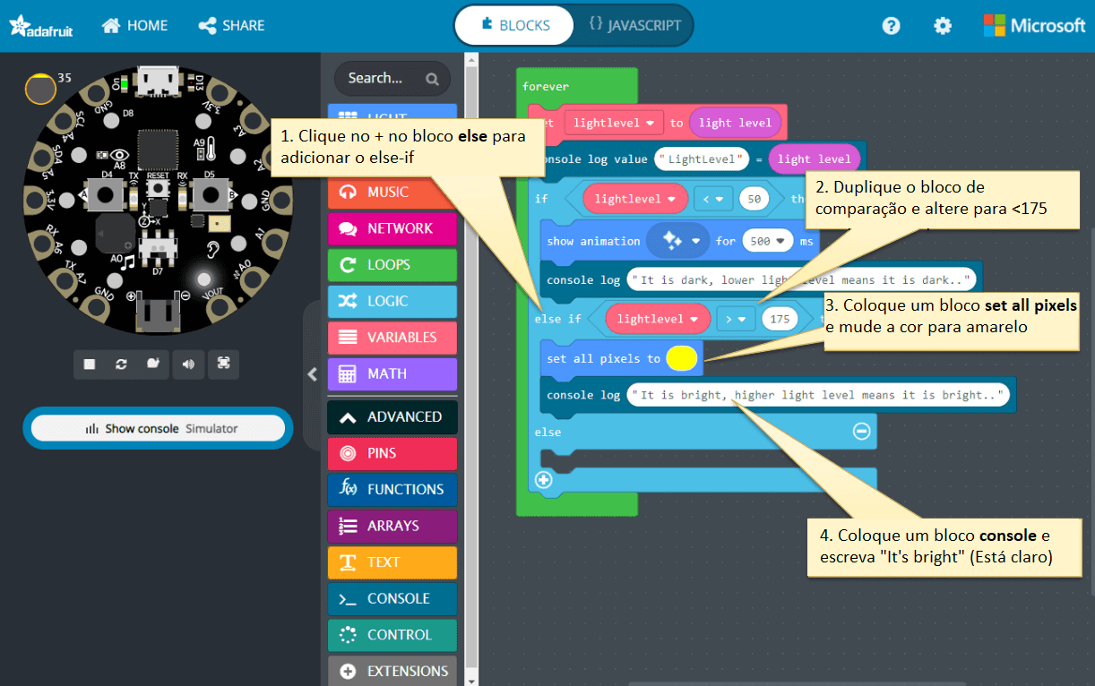- faça as luzes mudarem de cor com base no nível de iluminação SEM usar o bloco if-else e colorir os pixels diretamente.